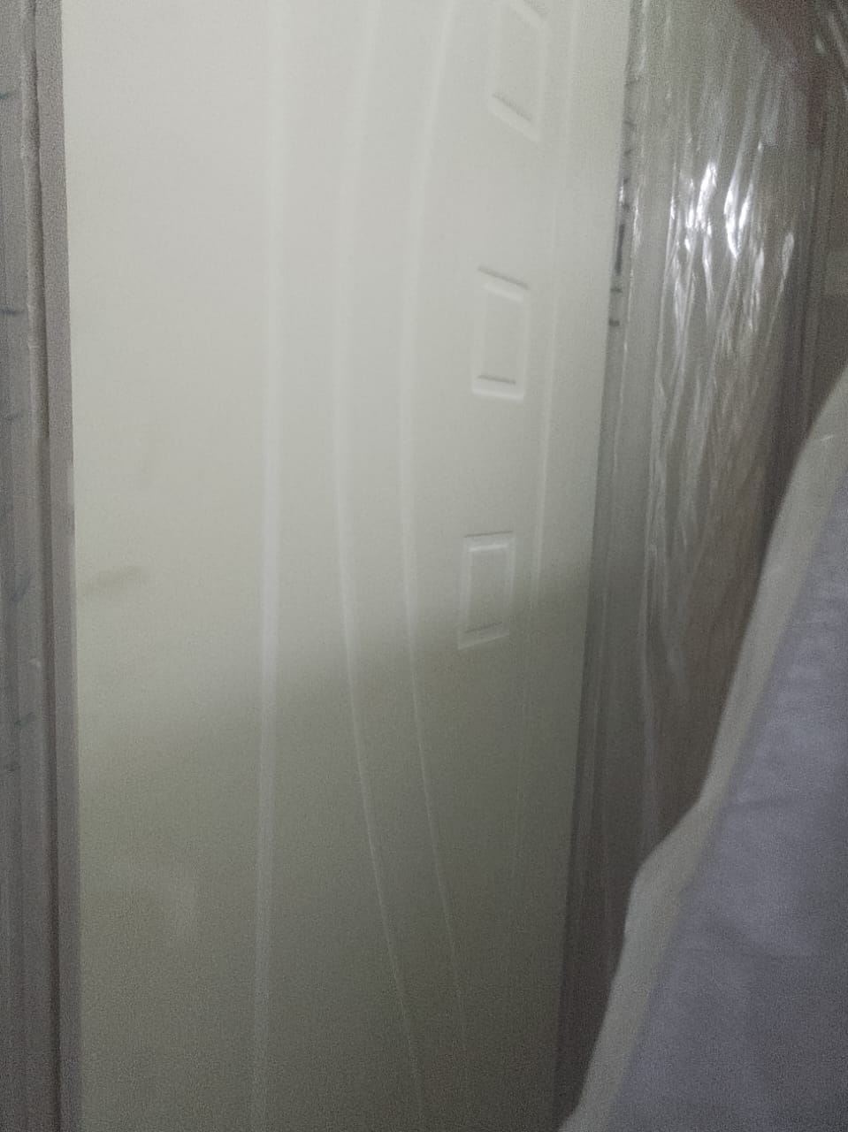 ఈ సెట్టింగ్ తలుపు అమ్మకానికి ప్యాక్ చేయబడి ఉండవచ్చు లేదా ఇన్‌స్టాలేషన్ కోసం వేచి ఉండవచ్చు అని సూచిస్తుంది. ప్రధాన తలుపు మరియు దాని చుట్టూ ఉన్న ప్రాంతం స్పష్టమైన రక్షిత ప్లాస్టిక్ ఫిల్మ్‌తో కప్పబడి ఉంటుంది, ఇది కొద్దిగా ముడతలు పడి కాంతిని ప్రతిబింబిస్తుంది, ఇది దాని కొత్త, ఫ్యాక్టరీలో చుట్టబడిన స్థితిని సూచిస్తుంది. ఎడమ వైపున, మరొక తెల్లటి తలుపు కూడా చుట్టబడి ఉండవచ్చు, ఇది పాక్షికంగా కనిపిస్తుంది. కుడి వైపున ఉన్న ప్రాంతం మరింత ప్లాస్టిక్ షీట్ మరియు బహుశా పెద్ద, లేత రంగు వస్తువు లేదా ఫాబ్రిక్ (బహుశా ప్యాకేజింగ్‌లో భాగం లేదా మరొక తలుపు చుట్టడం) ద్వారా అస్పష్టంగా ఉంటుంది, ఇది స్వల్ప నీడను కలిగిస్తుంది మరియు పరిమితమైన, మసకబారిన నిల్వ స్థలం యొక్క భావనను పెంచుతుంది.